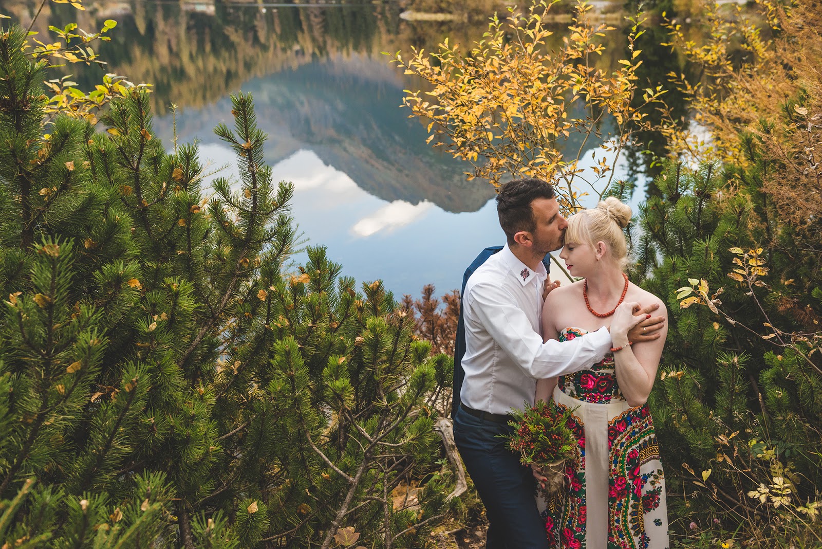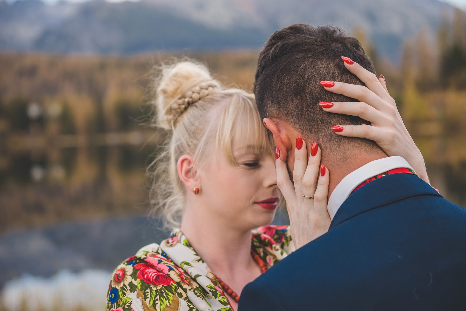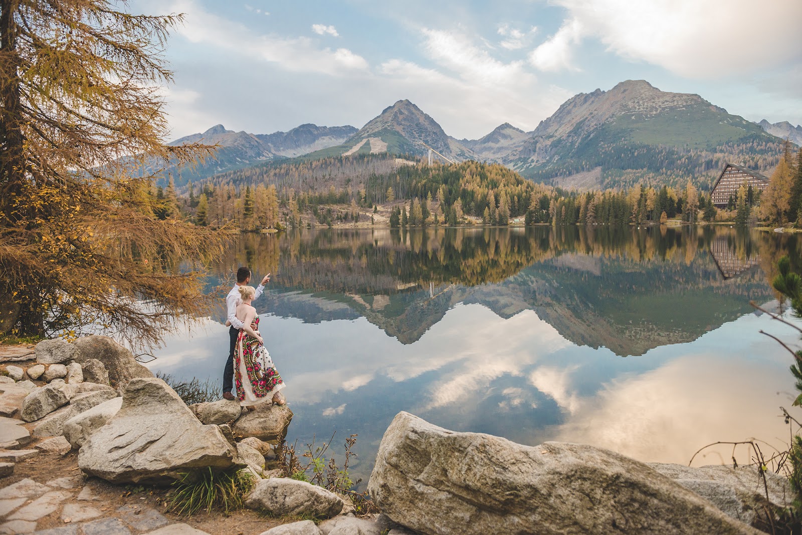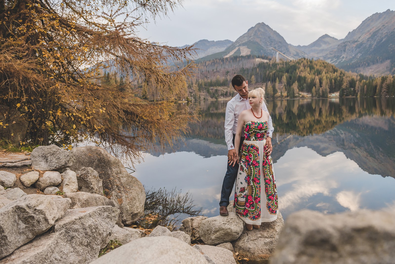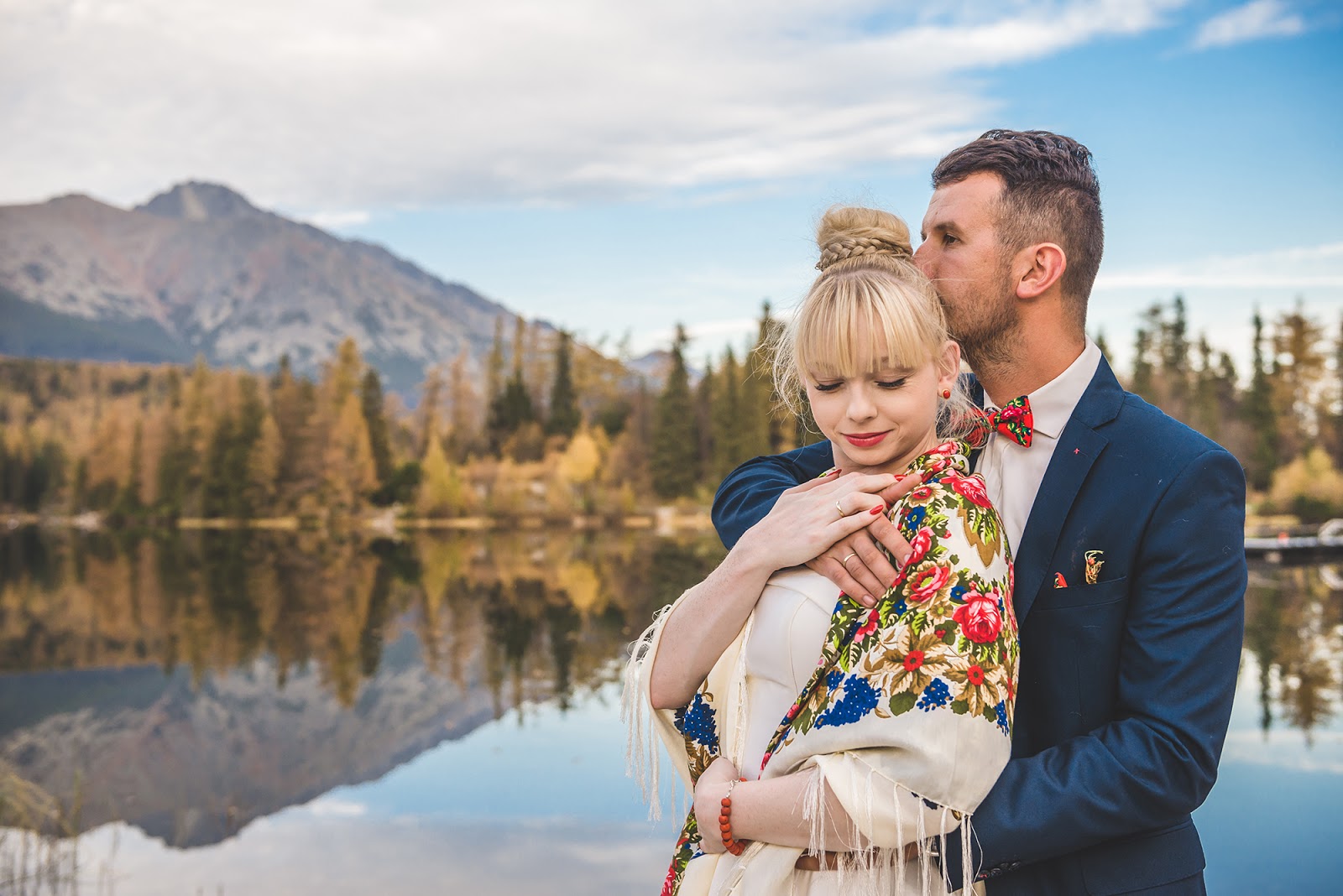 To miejsce zawładnęło nami! Scrbskie Pleso (Szczyrbskie Jezioro) na Słowacji to idealne tło do sesji zdjęciowej. W zależności od pory dnia i pory roku zmienia swoje oblicze. Raz może być tajemnicze, mgliste i zimne, by za parę chwil odsłonić nam swój największy urok, spokojną, oświetloną przez promienie słońca taflę jeziora, na której niesamowicie odbijają się pobliskie szczyty. Ta sceneria świetnie sprawdzi się przy każdej ślubnej ( i nie tylko! ) stylistyce. Na sesję w tym miejscu mieliśmy raptem godzinkę do zmroku. Jednak ta chwila wystarczyła, miłość Kasi i Michała oraz ich piękna stylizacja w stylu góralskim idealnie zagrała z tym miejscem.