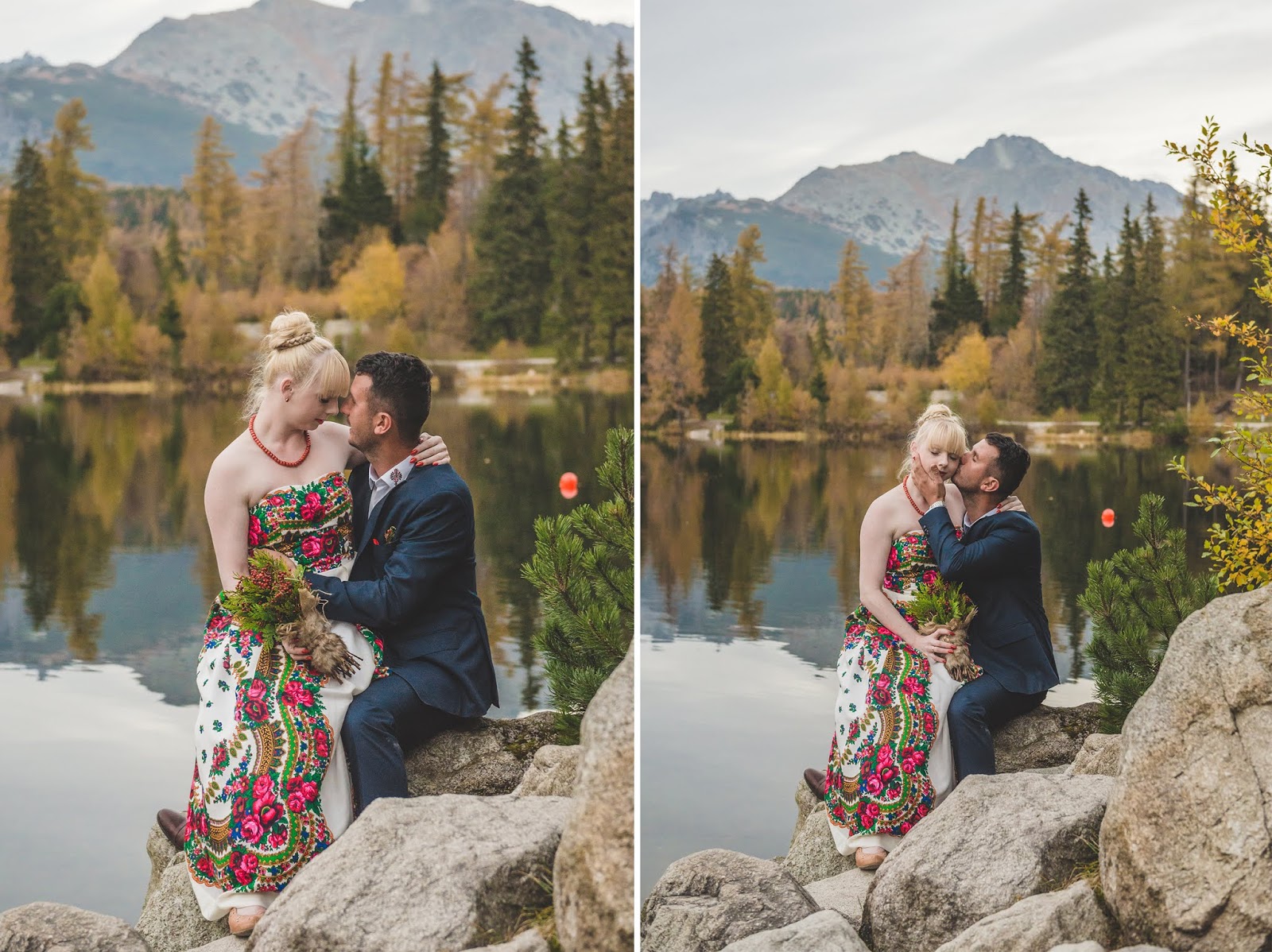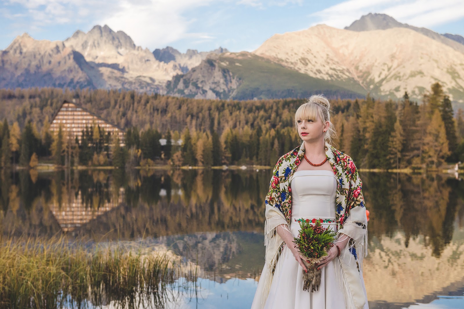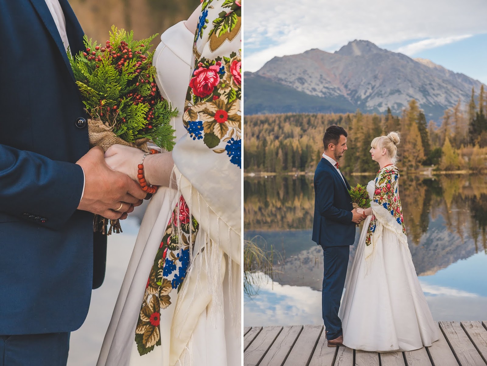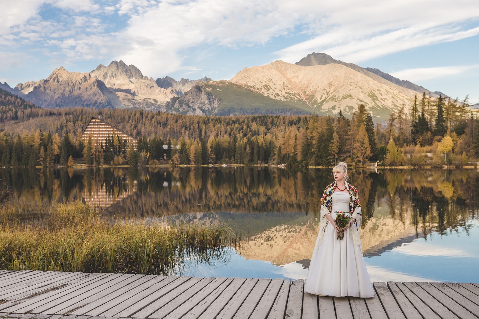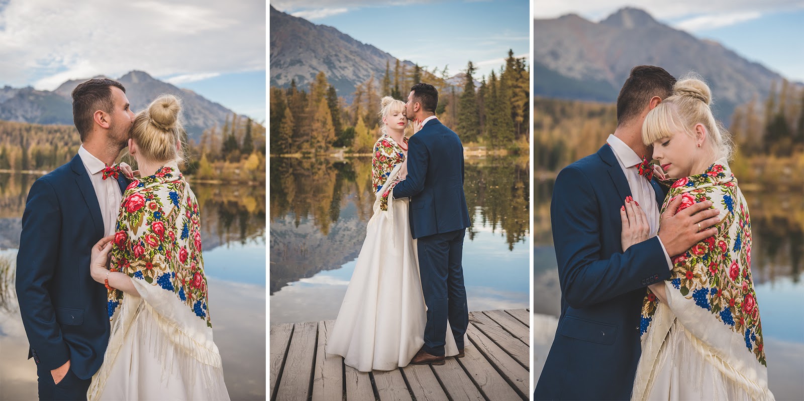 To miejsce zawładnęło nami! Scrbskie Pleso (Szczyrbskie Jezioro) na Słowacji to idealne tło do sesji zdjęciowej. W zależności od pory dnia i pory roku zmienia swoje oblicze. Raz może być tajemnicze, mgliste i zimne, by za parę chwil odsłonić nam swój największy urok, spokojną, oświetloną przez promienie słońca taflę jeziora, na której niesamowicie odbijają się pobliskie szczyty. Ta sceneria świetnie sprawdzi się przy każdej ślubnej ( i nie tylko! ) stylistyce. Na sesję w tym miejscu mieliśmy raptem godzinkę do zmroku. Jednak ta chwila wystarczyła, miłość Kasi i Michała oraz ich piękna stylizacja w stylu góralskim idealnie zagrała z tym miejscem.