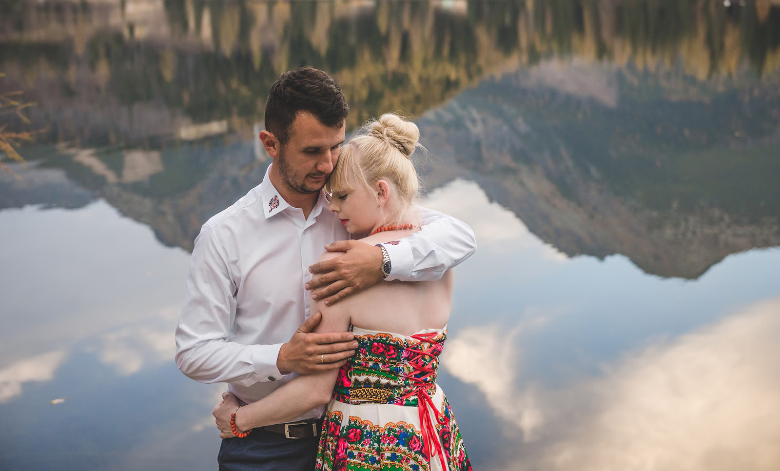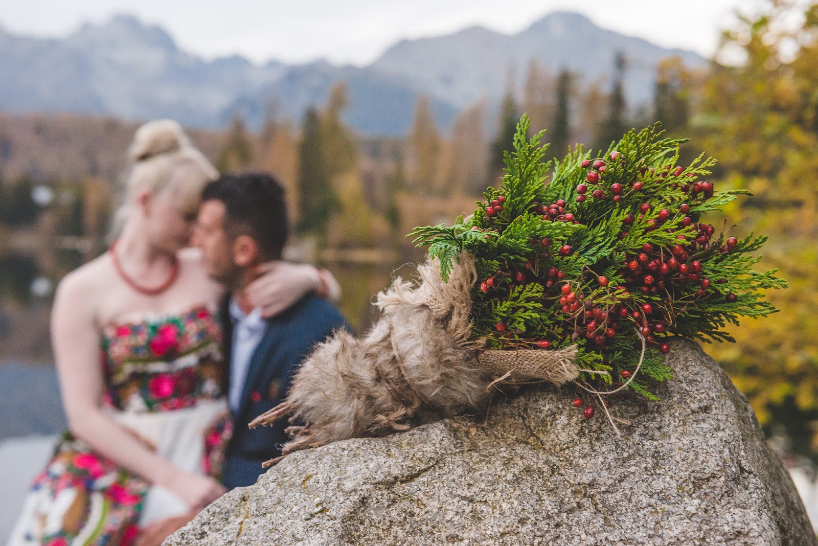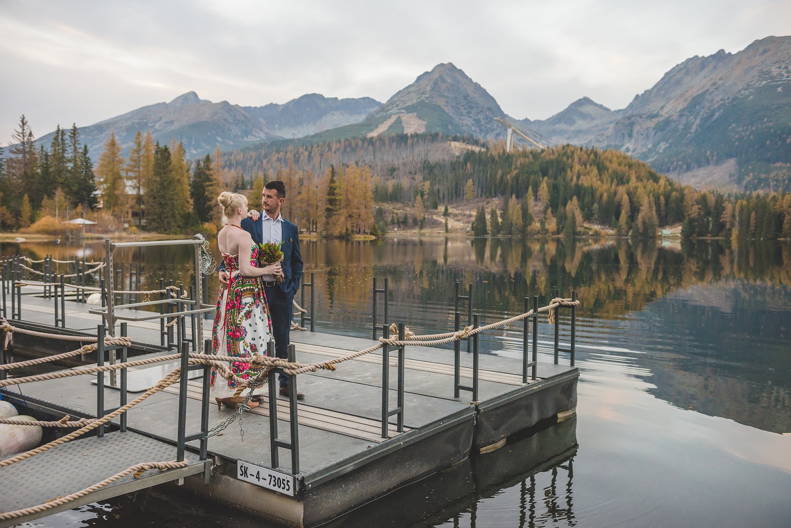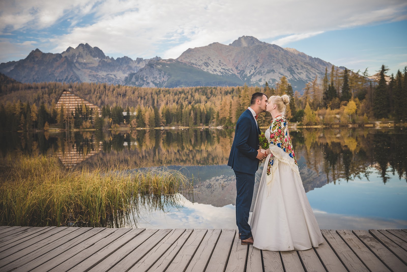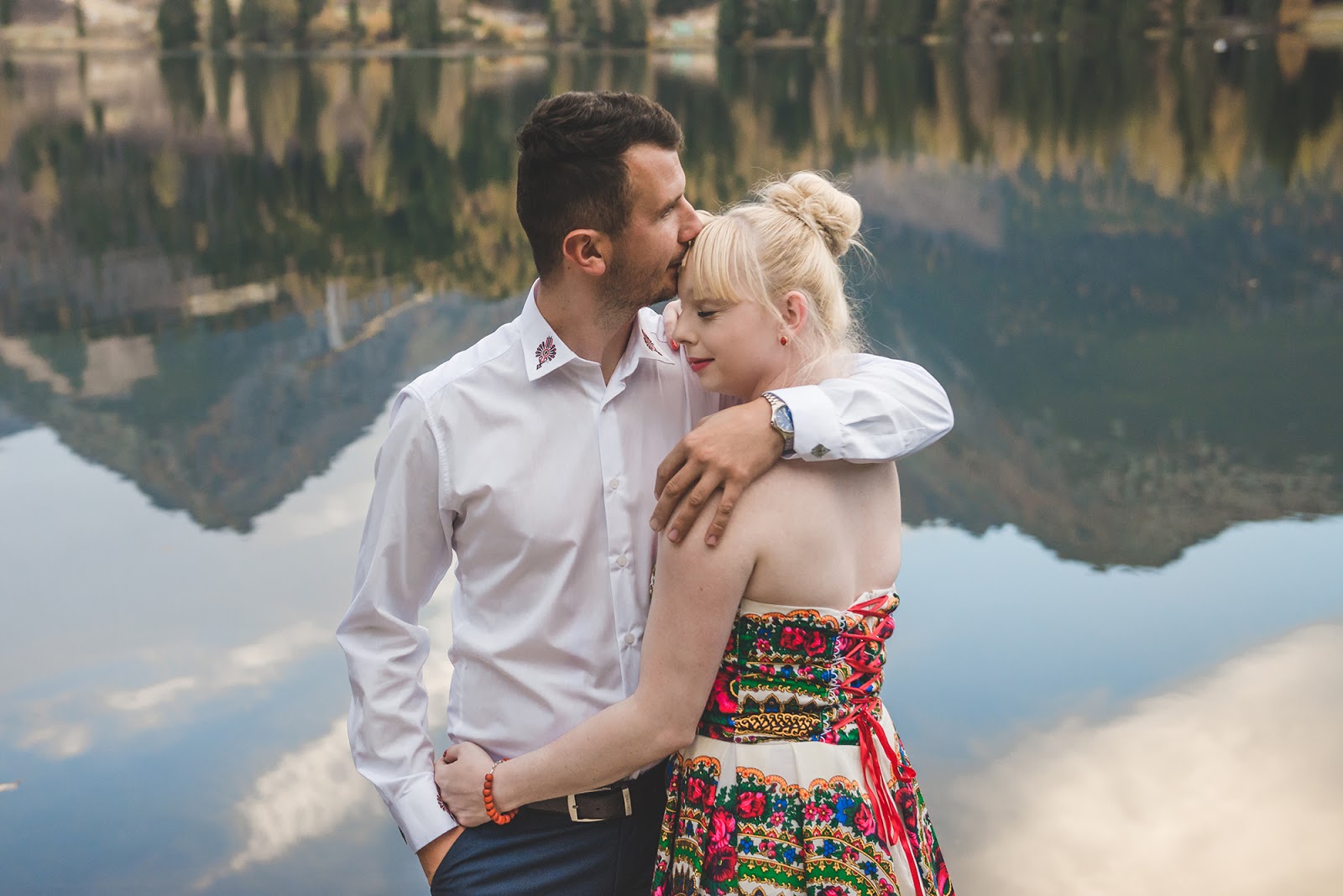 To miejsce zawładnęło nami! Scrbskie Pleso (Szczyrbskie Jezioro) na Słowacji to idealne tło do sesji zdjęciowej. W zależności od pory dnia i pory roku zmienia swoje oblicze. Raz może być tajemnicze, mgliste i zimne, by za parę chwil odsłonić nam swój największy urok, spokojną, oświetloną przez promienie słońca taflę jeziora, na której niesamowicie odbijają się pobliskie szczyty. Ta sceneria świetnie sprawdzi się przy każdej ślubnej ( i nie tylko! ) stylistyce. Na sesję w tym miejscu mieliśmy raptem godzinkę do zmroku. Jednak ta chwila wystarczyła, miłość Kasi i Michała oraz ich piękna stylizacja w stylu góralskim idealnie zagrała z tym miejscem.